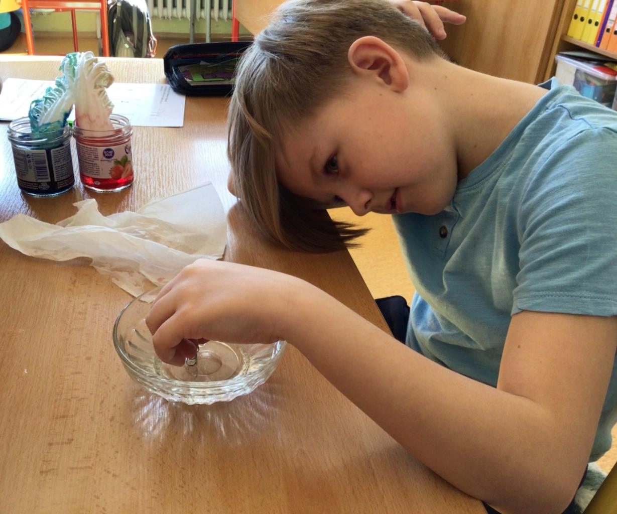 V dalším pokusu jsme si ukázali, že mýdlo odpuzuje špínu, vyrobili jsme si vodní lupu, zkoušeli jsme, jestli se kancelářské sponky udrží na hladině, a ochutnávali jsme vodu – měli jsme vodu sladkou, slanou a kyselou.