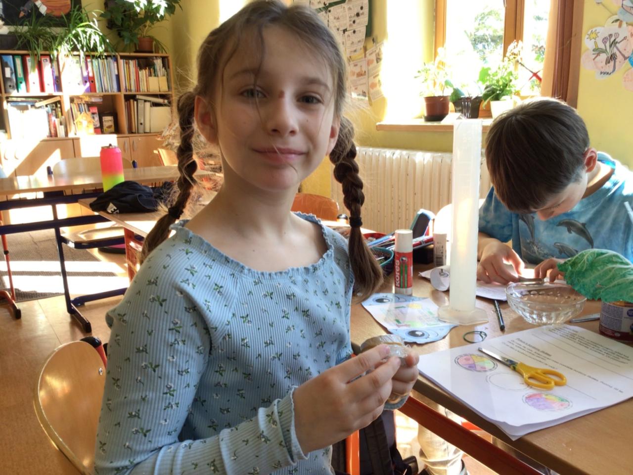 Nejvíce se nám líbil pokus s bonbony Skittles. Ty jsme ponořili do misky s vodou a pozorovali jsme, jak se postupně rozpouští a tvoří v misce malé barevné trojúhelníčky (vypadalo to jako barevná pizza). Postupně se všechny barvy smíchaly dohromady.