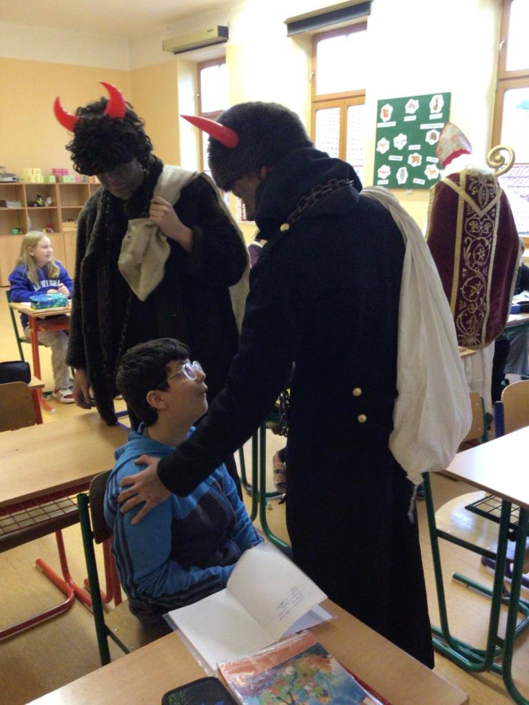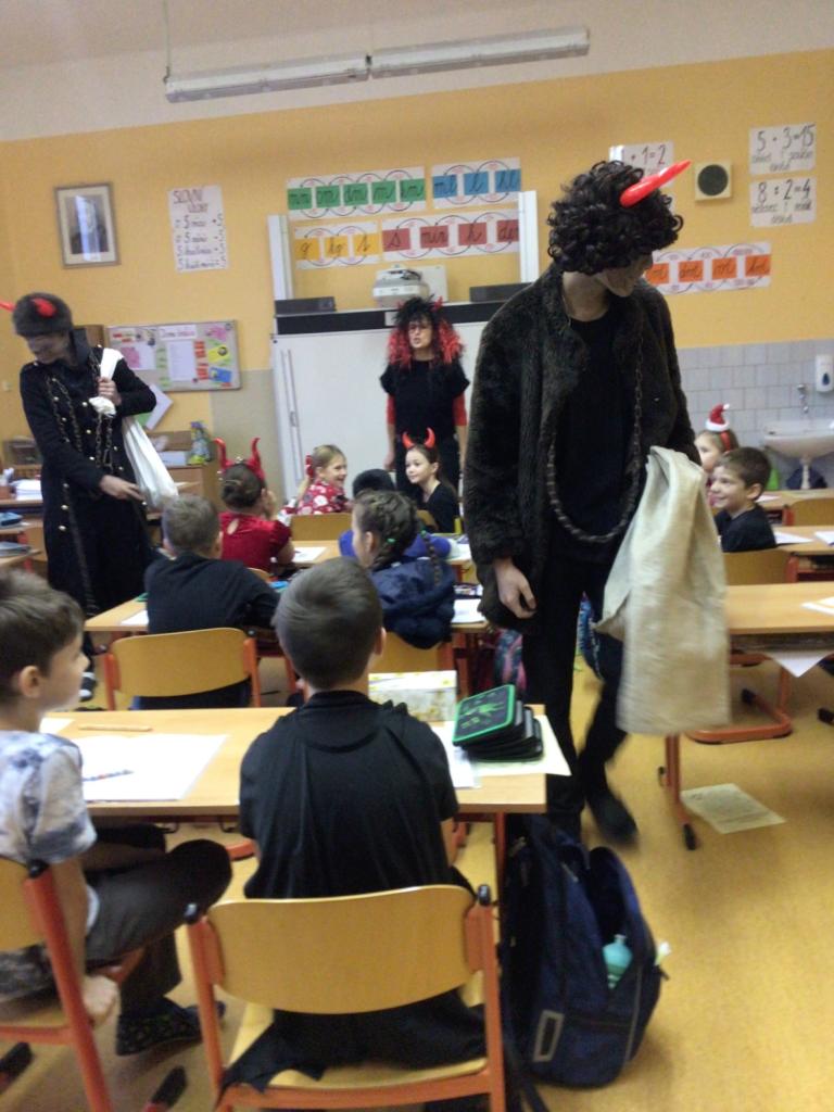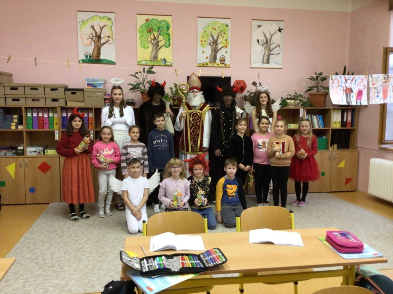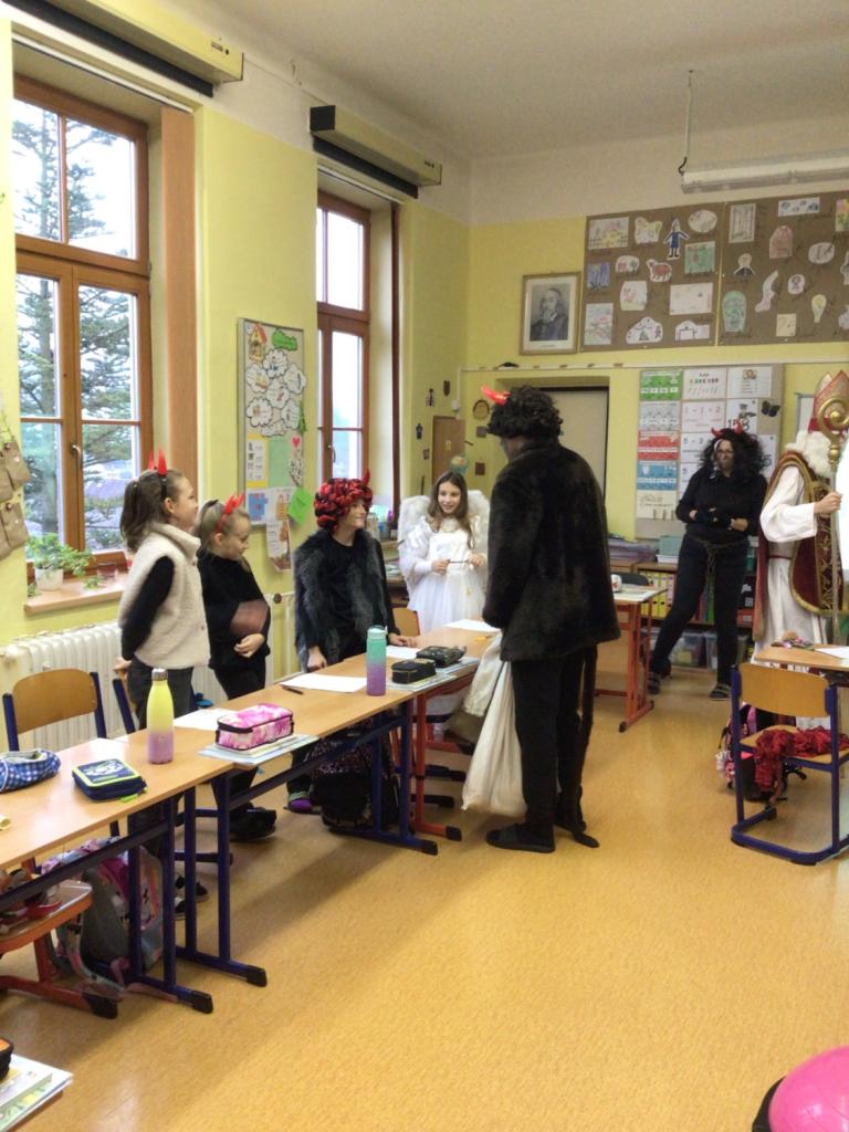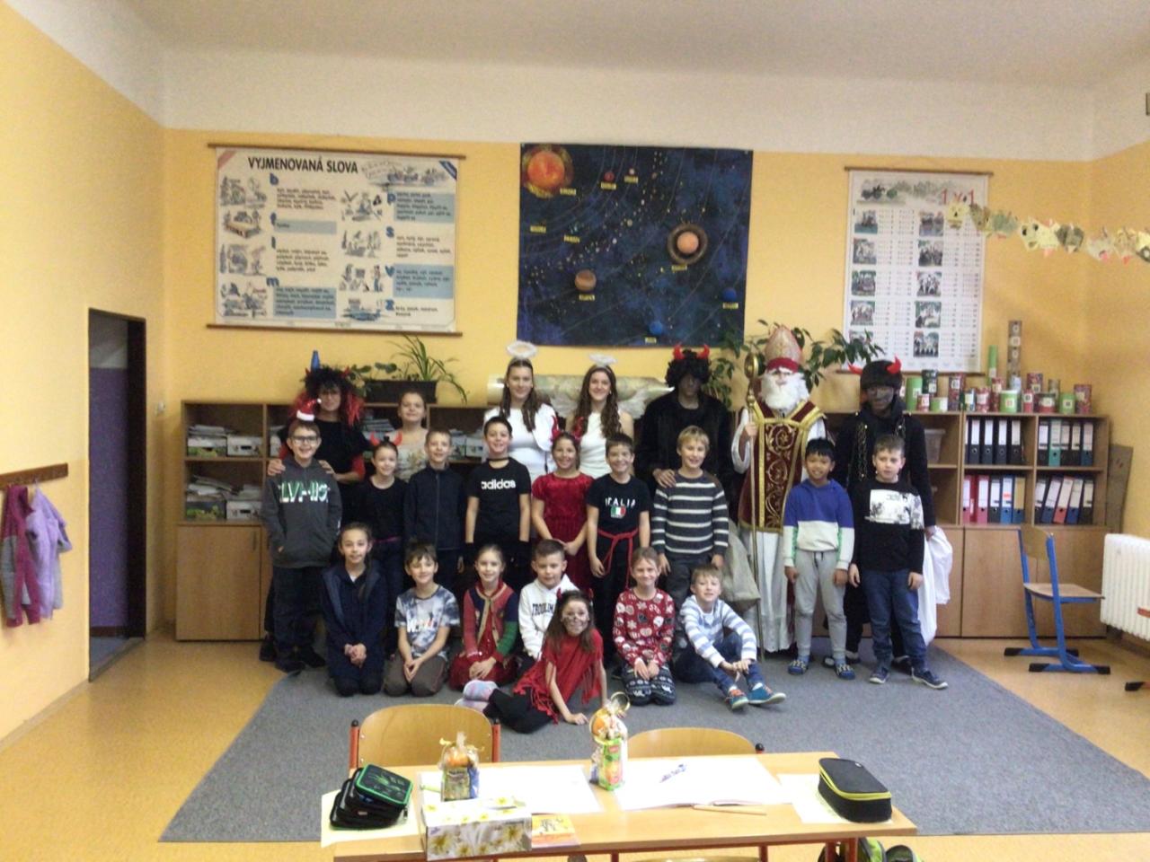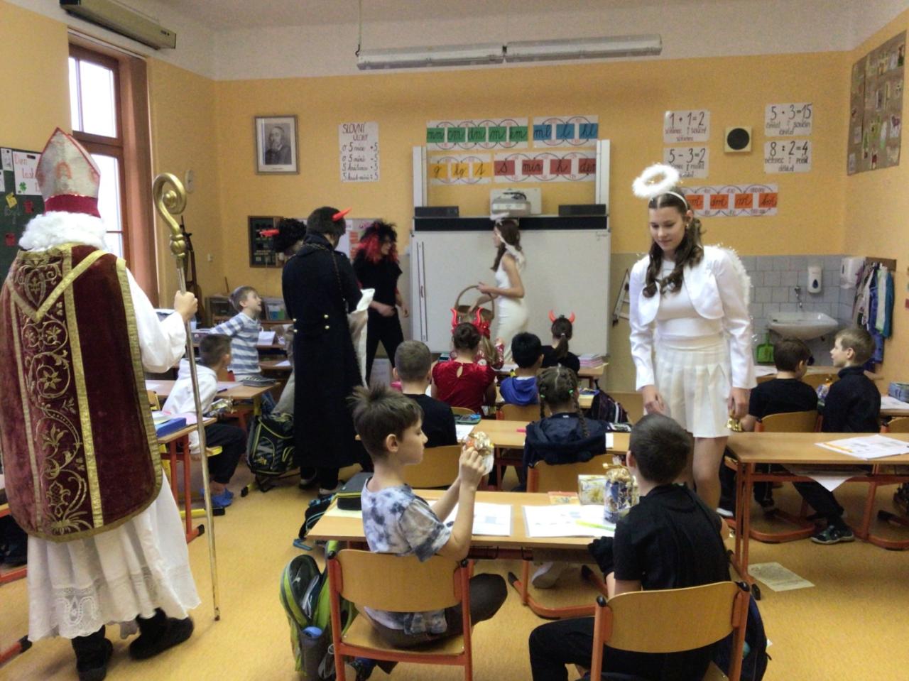 Zrovna jsme se učili a najednou jsme uslyšeli zvonek. Všichni byli napjatí. Čerti nám zabušili na dveře a vtrhli do třídy. Za nimi vešel Mikuláš a dva andělé. Mikuláš se nejdříve zeptal dětí, jestli byly hodné. Čerti si prošli celou třídu a ty nejzlobivější z nás si vzali na chodbu. Tam „zlobivci“ museli slíbit, že se napraví. Mikuláš i andělé byli moc hodní. Anděl nesl košík s hromadou balíčků. V těch bylo ovoce, sladkosti a džus. Celá naše třída zazpívala písničku, za kterou nás Mikuláš pochválil. Krásní bílí andělé nám balíčky rozdali a pak všichni odešli do další třídy. Těšili jsme se na přestávku, až budeme moci balíčky rozdělat a mlsat. Nadílka se nám moc líbila.