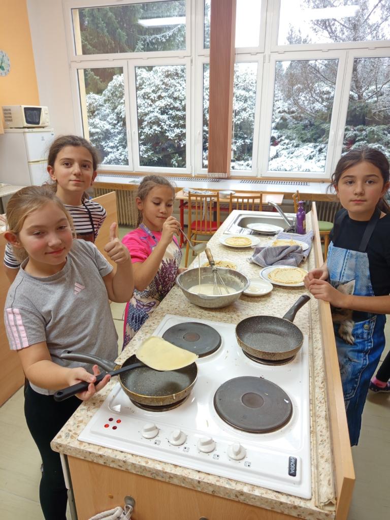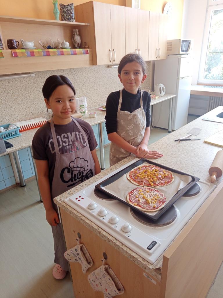 Často kombinujeme přípravu studených i teplých pokrmů a pečení. Obvykle pracujeme v malých skupinkách, což rozvíjí jejich schopnost týmové komunikace. Děti se naučí základní techniky jako je loupání, strouhání, míchání a bezpečné ovládání kuchyňských spotřebičů. Tak pojďte nahlédnout do naší kuchyně.