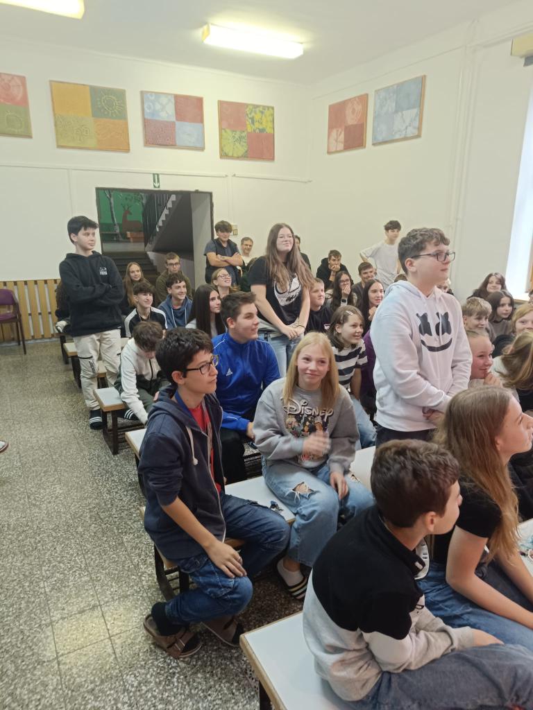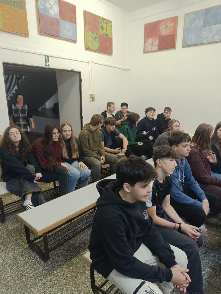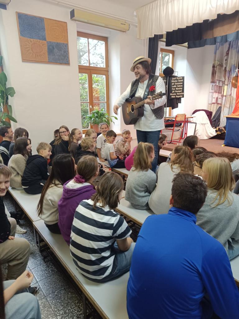 Na závěr nám herci představili Divadlo Járy Cimrmana, které je založené na specifickém, trochu absurdním humoru. Ukázali nám část ze hry Vyšetřování ztráty třídní knihy, která byla velmi vtipná, ale zároveň si dělala legraci ze školního prostředí a lidských vlastností. Tento typ humoru byl jiný než na začátku představení, ale moc se nám líbil, protože byl blízký našemu věku a školním zkušenostem.